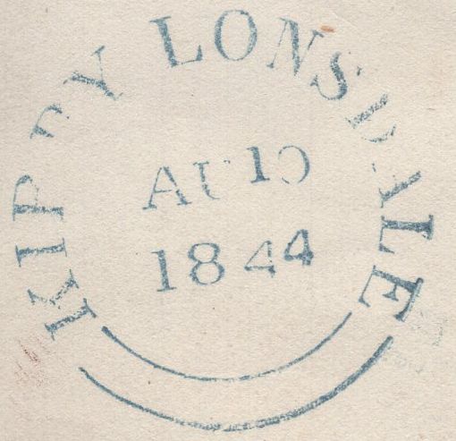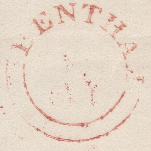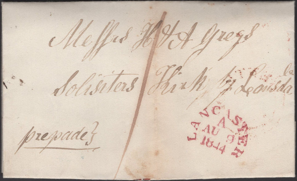 1844 MAIL HIGH BENTHAM, NORTH YORKS TO KIRBY LONSDALE WITH 'BENTHAM' UDC (YK283). Letter from 'High Bentham' to 'Messrs H and A Gregg, Solicitors, Kirby by Lonsdale', sent pre-paid '1' and on front fine strike 'LANCASTER' date stamp in mauve (LA637). On reverse good strike 'BENTHAM' udc in red (YK283) and 'KIRBY LONSDALE' date stamp AU 10 1844 in blue (Westmorland). Filing fold clear of all hand stamps. (Ref 135679).