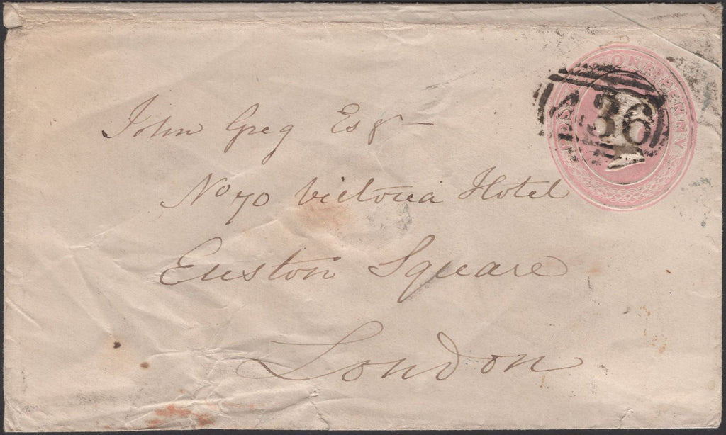 1847 1D PINK ENVELOPE LANCASTER TO LONDON WITH 'CATON' UDC (LA321). Used 1d pink envelope, small tear at foot and some creasing, from Lancaster to 'John Greg Esq, No. 70 Victoria Hotel, Euston Square, London' cancelled good to fine strike '436' numeral of Lancaster. On reverse fine to very fine strike 'CATON' udc in dark blue (LA321) and 'LANCASTER' date stamp MY 12 1847 also in dark blue. (Ref 135686).