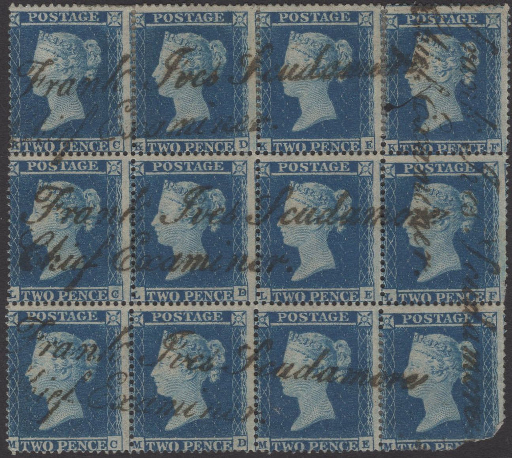 1854 2D BLUE PL.4 S.C.16 (SG19) WITH 'Frank Ives Scudamore/Chief Examiner' HAND STAMPS. The unique unused block of 12 1854 2d blue pl.4 S.C.16 (SG19) lettered KC - MF, some faults, with four complete strikes of the 'Frank Ives Scudamore/Chief Examiner' hand stamp in black. A great rarity on the 2d blue, listed by SG with the centre strip of four illustrated in the specialised catalogue. (Ref 135963).