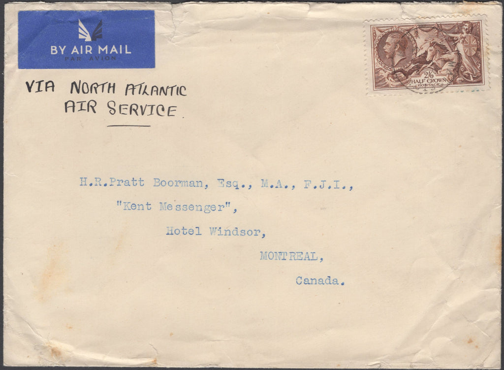 • 136069 1939 AIR MAIL MAIDSTONE, KENT TO MONTREAL, CANADA WITH 2/6 RE-ENGRAVED SEAHORSE (SG450).