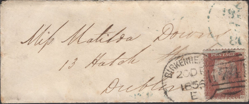 1856 MAIL BIRKENHEAD TO DUBLIN WITH 1D (SG29) 'BIRKENHEAD/74' SPOON (RA1). Envelope from Birkenhead to 'Mifs Matilda Downs, 13 Hatch Street, Dublin' with die 2 1d red-brown on blued paper (SG29) lettered HG, some imperfections tied fine large part strike 'BIRKENHEAD/74' spoon (RA1) 20 DE 1856 code 'E'. On reverse Dublin date stamp DE 21 1856. (Ref 136090).