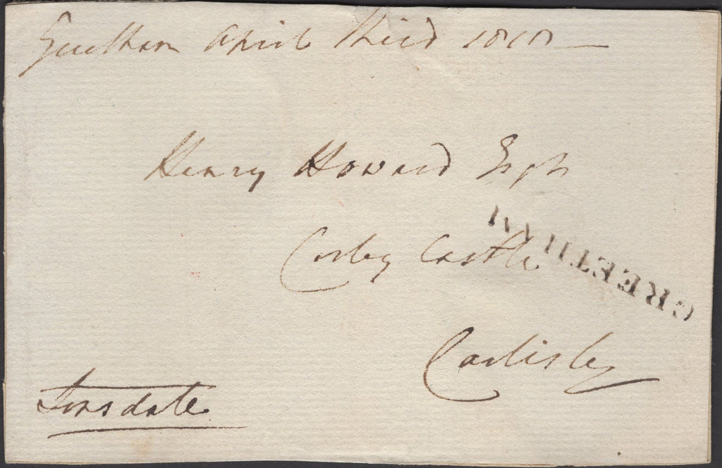 1810 FREE MAIL GREETHAM, RUTLAND TO CARLISLE WITH 'GREETHAM' STRAIGHT LINE HAND STAMP (RU2). Free front from Greetham dated April 3rd 1810 to 'Henry Howard Esq, Corby Castle, Carlisle' with fine strike 'GREETHAM' straight line hand stamp in black (RU2). (Ref 136171).