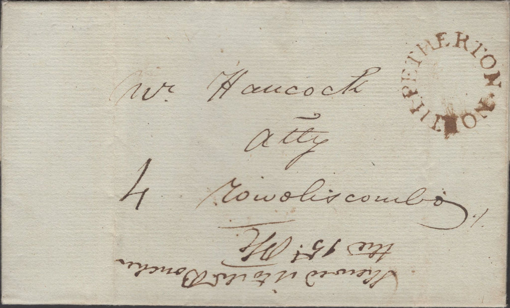 1802 MAIL MINEHEAD, SOMERSET TO WIVELISCOMBE WITH 'NORTH PETHERTON.' UDC (SO640). Fine letter from Minehead dated 13th June 1802 to 'Mr Hancock, Atty, Wiveliscombe', charged '4' and on front fine strike 'NORTH PETHERTON.' udc in black (SO640). (Ref 136172).