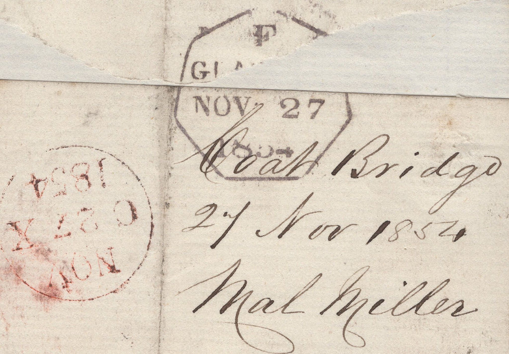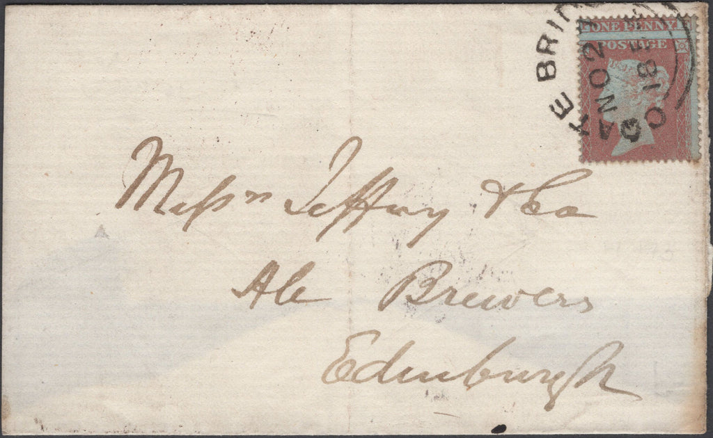 1854 LARGE PART WRAPPER COATE BRIDGE, LANARKSHIRE TO EDINBURGH WITH 1D PL.173 (SG17) WITH 'COATE BRIDGE' DATE STAMP. Fine large part wrapper from Coate Bridge to 'Mefsrs Jeffery and Co, Ale Brewers, Edinburgh' with very fine die 1 1d pl.173 S.C.16 (SG17) lettered QF and tied solely by a very fine large part strike 'COATE BRIDGE' circular date stamp NO 22 1854. Stamp shows MISPLACED SHEET VARIETY with lettering 'PF' of stamp above at top of stamp. (Ref 136181).