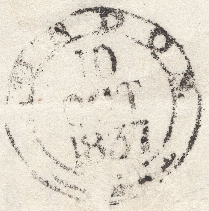 1837 MAIL LAUSANNE TO SUFFOLK, RE-DIRECTED TO LONDON. Wrapper from Lausanne to 'The Duke of Hamilton, Easton Park, Wickham Market, Suffolk' with 'LAUSANNE' date stamp 4 OCT 1837 and then re-directed to '12 Portman Square, London' with charge of '1/9'. On front light strike 'Woodbridge/Penny Post' hand stamp in black (SK404) also good strike of the very scarce 'RETURNED FROM/WOODBRIDGE' instructional hand stamp in black (SK408). On reverse 'LONDON' Foreign Office date stamp 10 OCT 1837. (Ref 136196).