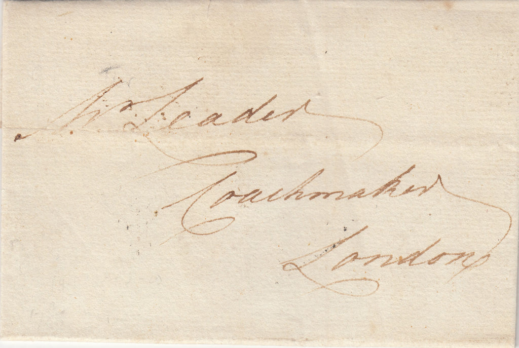1785 MAIL STREATHAM TO LONDON WITH SOUTHWARK DOCKWRA (L354). Fine letter from Streatham dated March 3rd 1785 to 'Mr Leader, Coach Maker, London' with good to fine strike Southwark Dockwra handstamp with 'PENNY' at left and within 'S/FR' (L354). Also on reverse light strike time handstamp and manuscript 'Mitcham' receivers signature. Letter discusses colour of the Coach the trim, lamps and Arms. (Ref 142697).