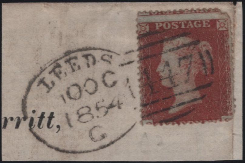 1854 SMALL PIECE 'LEEDS/447' SPOON TYPE 'A' (RA47). Small piece with Die 1 1d (SG17), corner fault with good to fine strike 'LEEDS/447' spoon type 'A' (RA47) 10 OC 1854 code 'G'. (Ref 141175).