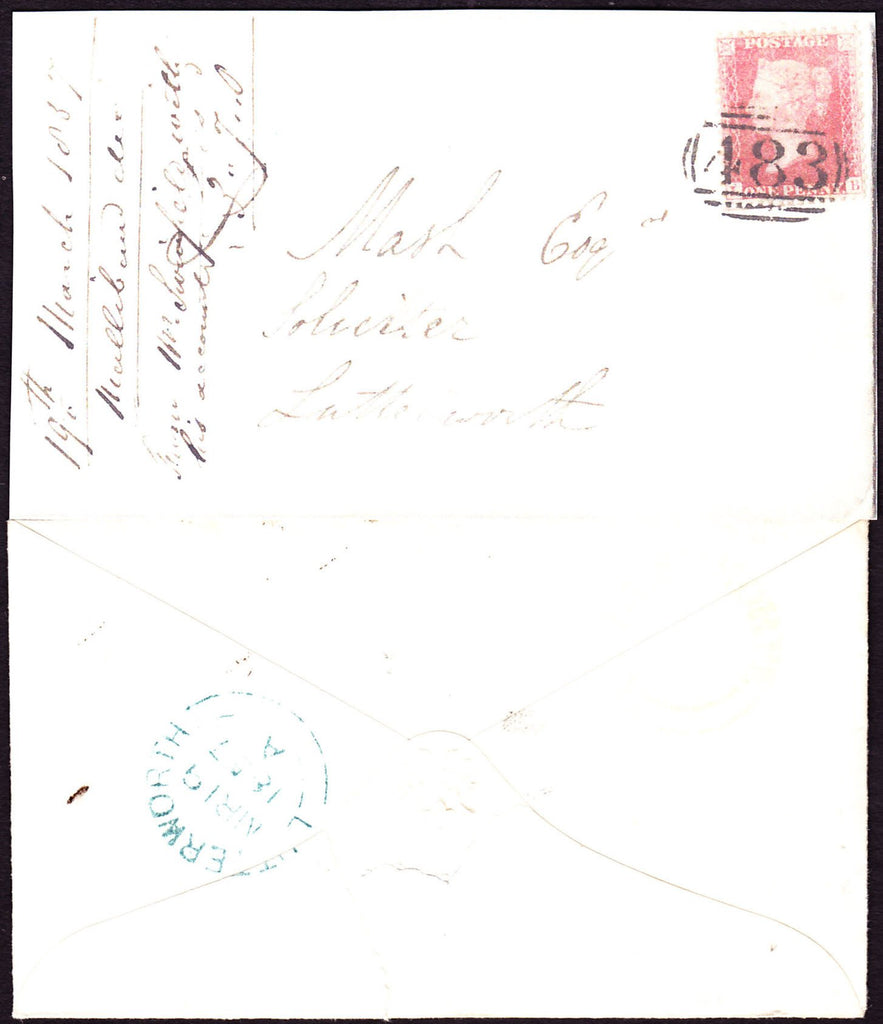 1857 LEICS/'ULLESTHORPE' UDC (LC186)/1D TRANSITIONAL(SPEC C9) ON COVER. Envelope used locally in Lutterworth with very fine early Die 2 1d pale rose on transitional paper (very slight blueing) (Spec C9(4) lettered LB tied very fine "483" numeral of Lutterworth. On reverse good strike  'ULLESTHORPE' udc in pale green (LC186), only example so far recorded- this being the listing example in latest Co. cat. (Ref 64905).