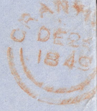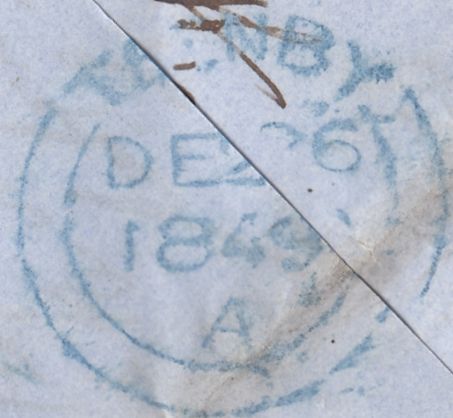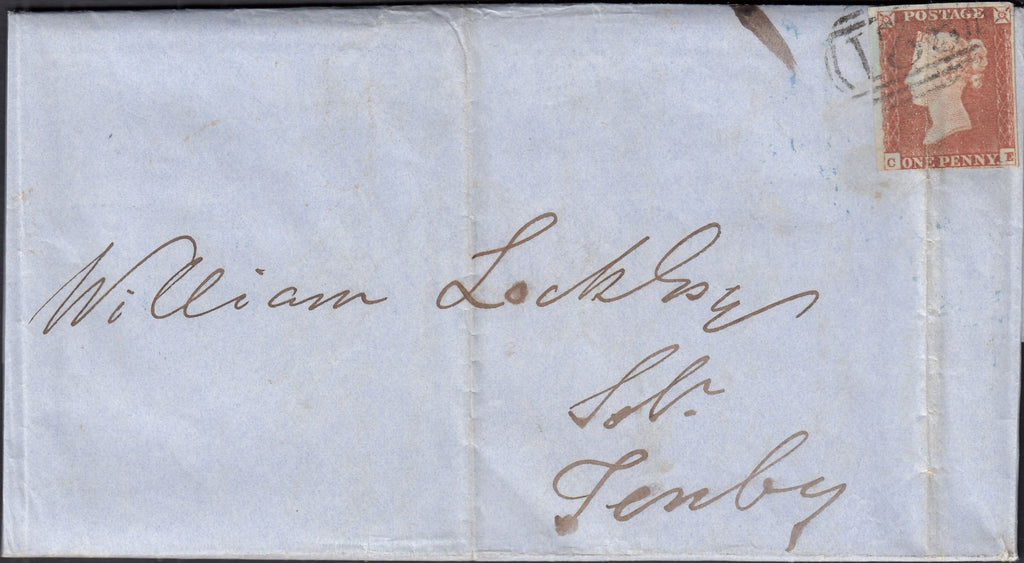 1849 MAIL GRANTHAM TO TENBY WITH '321' GRANTHAM NUMERAL. Letter Grantham to 'William Lock Esq. Solr. Tenby' dated 24th Dec 1849 with 1d (SG8) lettered CE, four close to good margins but filing creases affect, tied '321' numeral of Grantham. On reverse GRANTHAM date stamp DE 24 1849 in orange and TENBY date stamp DE 26 1849 in blue. Also 1907 post card of Tenby used in London. (2 items). (Ref 126927).