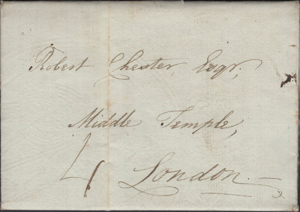 1782 MAIL ALFORD, LINCS TO LONDON (QAB) WITH 'SPILSBY' HAND STAMP (LI930?). Fine letter from Alford dated Apr 13 1782 to 'Robert Chester Esqr, Middle Temple, London', charged '4' and on reverse good to fine strike 'SPILSBY' straight line hand stamp in black, 38 x 7 (LI930?). Letter references the curacy of Rigsby. (Ref 137416).