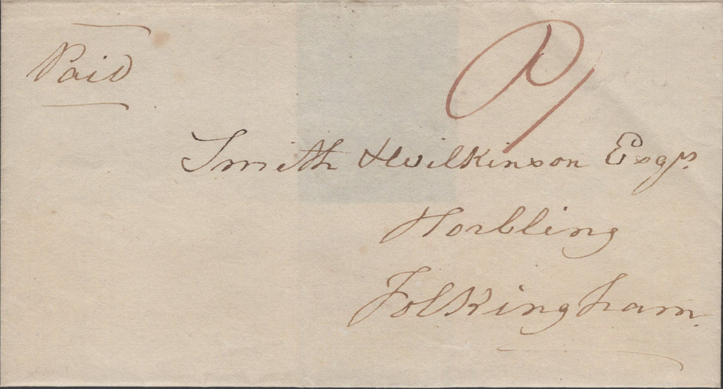 1840 UNIFORM PENNY POST SPILSBY TO FOLKINGHAM WITH 'SPILSBY' UDC (LI954). Undated wrapper from Spilsby to 'Smith Wilkinson Esq, Horbling, Folkingham', post paid '1' and on reverse fine to very fine strike 'SPILSBY' udc (LI954). Whilst undated this must be 1840 Uniform Penny Post usage - udc recorded 1832-1840, 38 miles single letter 1812-1839 charged 7d, 1839 4d rate until 1840 1d UPP introduced. (Ref 137426).