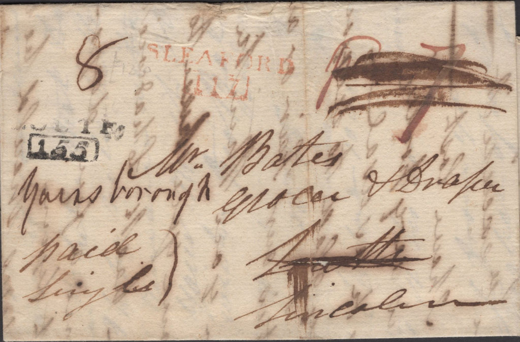 1811 MAIL SLEAFORD TO LOUTH, RE-DIRECTED TO GAINSBOROUGH WITH 'SLEAFORD/117' MILEAGE MARK (LI850) AND 'LOUTH/155' MILEAGE MARK (LI694). Letter from Sleaford dated 10th October 1811 to 'Mr Bates, Grocer and Draper, Louth', post paid '7' (?) with good to fine strike 'SLEAFORD/117' mileage mark type 29 in red (LI850), re-directed to Gainsborough with charge of '8' and fair strike 'LOUTH/155' mileage mark type 29 in black (LI694). Unusual to find two different mileage marks in two different colours. (Ref 137436).