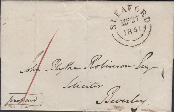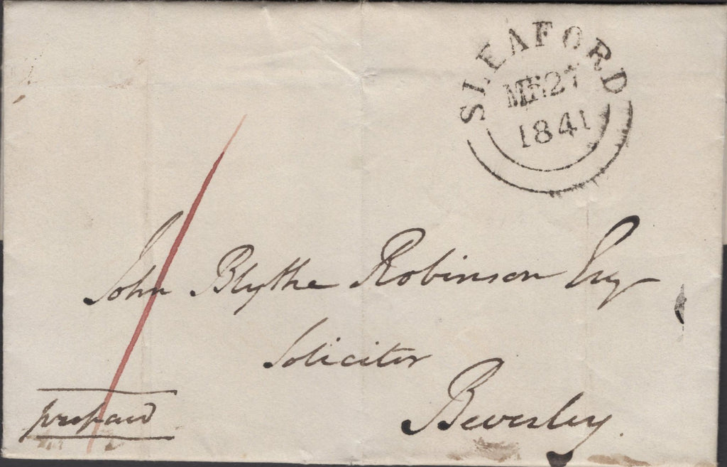 1841 MAIL SLEAFORD TO BEVERLEY WITH 'SLEAFORD' DATE STAMP (LI861). Letter from Sleaford to 'John Blythe Robinson Esq, Solicitor, Beverley', post paid '1' and on front fine strike 'SLEAFORD' date stamp MR 27 1841 in black (LI861). (Ref 137444).
