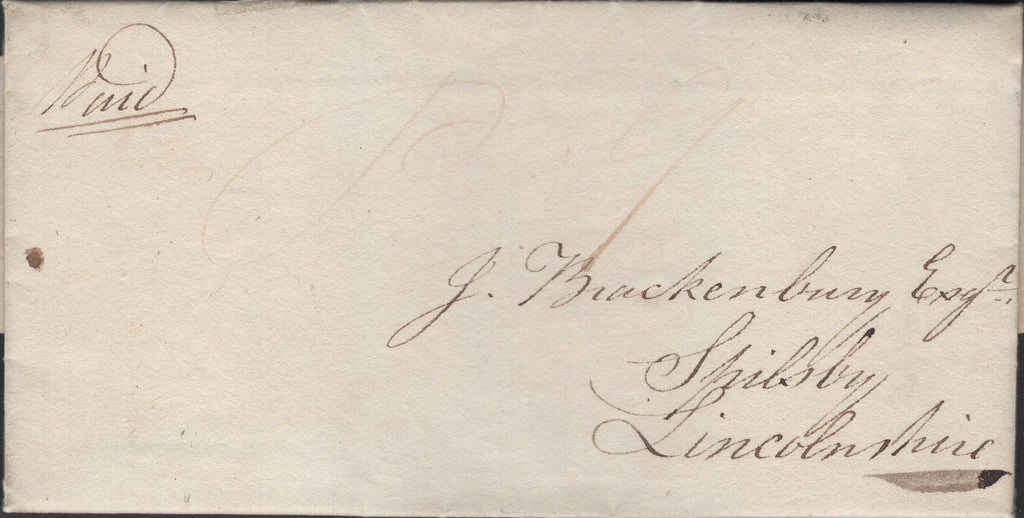 1822 MAIL GRIMSBY TO SPILSBY WITH TWO STRIKES 'GRIMSBY/178' MILEAGE MARK (LI462). Letter from Grimsby dated April 4th 1822 to 'J Brackenbury Esq, Spilsby, Lincolnshire', post paid '1' and on reverse two good strikes 'GRIMSBY/178' mileage mark in black (LI462). (Ref 137461).