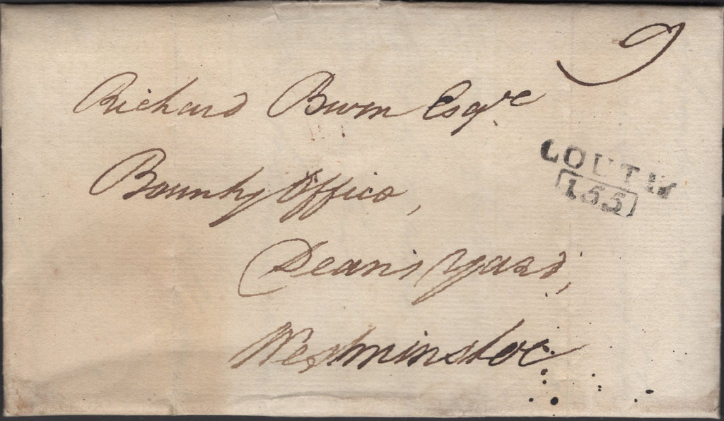 1810 MAIL LOUTH TO LONDON WITH 'LOUTH/155' MILEAGE MARK (LI694). Letter from Louth dated 25 Oct 1810 to 'Richard Burn Esq, Bounty Office, Dean's Yard, Westminster' (Queen Anne's Bounty), charged '9' and on front fine to very fine strike 'LOUTH/155' mileage mark in black (LI694). Letter references the Augmentation of the Living of Marsh Chapel and purchase of 'a very valuable piece of ground adjoining the Vicarage House of Fulstow...'. (Ref 137548).