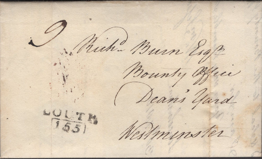 1810 MAIL BURWELL PARK, NORTH LINCS TO LONDON WITH 'LOUTH/155' MILEAGE MARK (LI694). Letter from Burwell Park dated 27th May 1810 to 'Richd Burn Esq, Bounty Office, Dean's Yard, Westminster' (Queen Anne's Bounty), charged '9' and on front fine strike 'LOUTH/155' mileage mark in black (LI694). Letter references the vicar of Burwell. (Ref 137550).