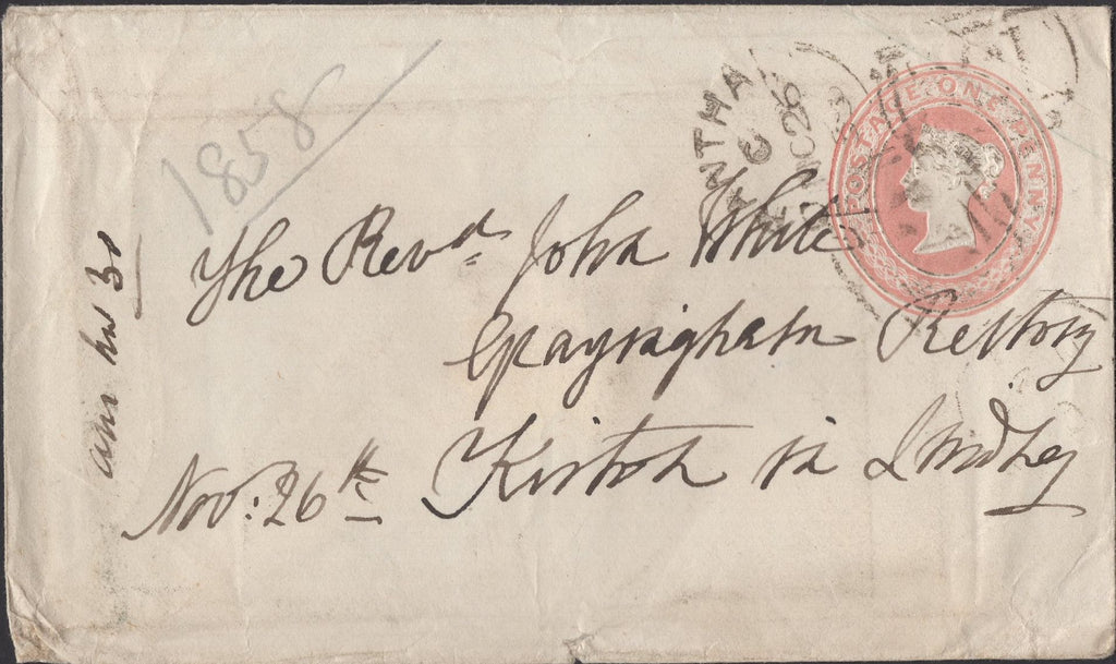 GROUP 'GRANTHAM/321' SIDEWAYS DUPLEX, 1857-1861 (FOUR ITEMS). Good group 'GRANTHAM/321' sideways duplex type II (2) and type VIII (2) comprising 1d pink envelope x 2 dated MR 20 1857 and NO 26 1858, envelope with SG40 dated FE 6 1861 and small piece with pair SG29 dated MR 30 1857. (4 items). (Ref 139697).