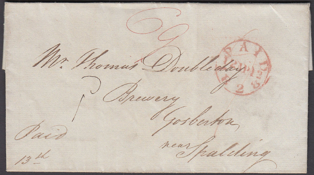 1827 LINCS/POSTMASTERS LOCAL DELIVERY CHARGE. Entire London to 'Mr Thos Doubleday Spirit Mercht Gosberton Lincolnshire' dated 25th Jany 1827. On front London PAID date stamp JA 25 1827 with manuscript '9' normal postage and local charge of '1d' for local delivery. Good example of this local practice. (Ref 82970).
