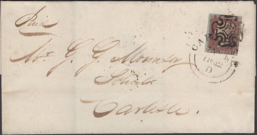 • 135240 1842 MAIL LIVERPOOL TO CARLISLE WITH 1D (SG8) CANCELLED LIVERPOOL MALTESE CROSS AND 'CARLISLE' DATE STAMP.