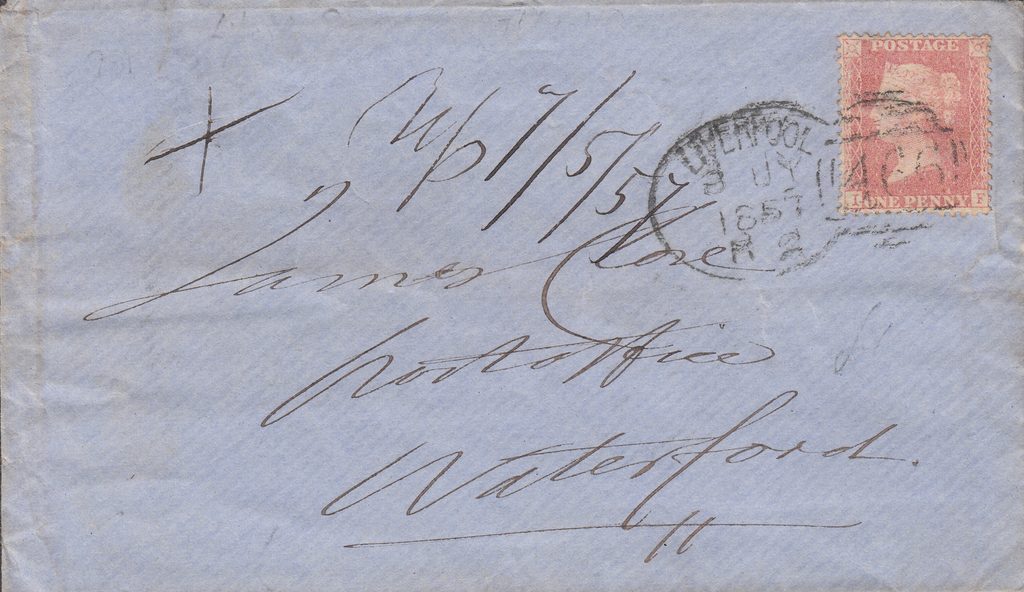 LIVERPOOL SPOON TYPE B2 RE-CUT (RA58) ON COVER. 1857 envelope Liverpool to Waterford with fine Die 2 1d pale rose on transitional paper (Spec C9(4) lettered IF tied fair strike LIVERPOOL/466 spoon type B2 re-cut 3 JY 1857 codes R 2. (Ref 83524).