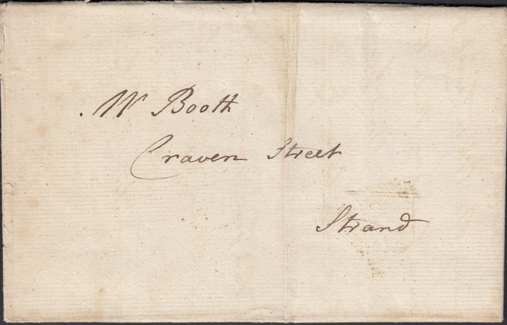 1781 MAIL USED IN LONDON WITH TEMPLE OFFICE DOCKWRA TYPE 3c (L366). Letter, some faults and damage on reverse and internally, used locally in London addressed to 'Mr Booth, Craven Street, Strand' dated 14th Feb 1781, on reverse fine strike Temple Office Dockwra type 3c (POST at left)(L366) and within 'T/WE'. Despite faults a fine looking example of the Dockwra hand stamp. (Ref 128518).