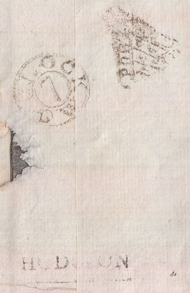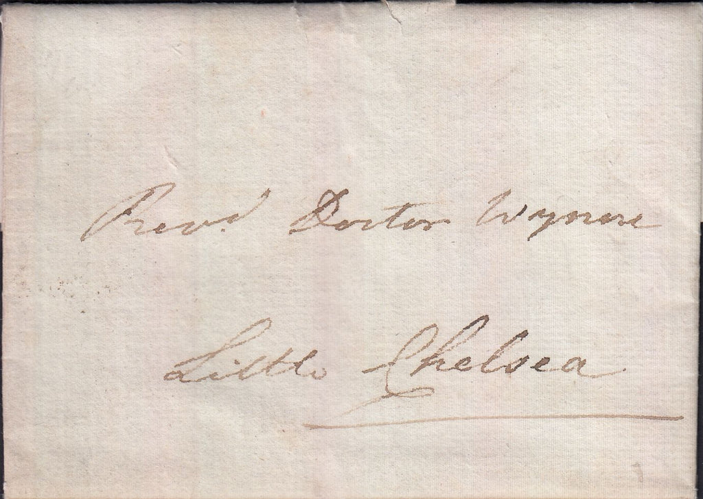 1786 MAIL USED LOCALLY IN LONDON WITH 'HODGSON' LONDON POST RECEIVER'S HAND STAMP (L375), TIME HAND STAMP (L368) AND WESTMINSTER DOCKWRA (L363a). Fine letter from Wimpole Street to 'Revd. Doctor Wynne, Little Chelsea' dated 4th Jan 1786, on reverse good strike 'HODGSON' straight line London Post receiver's hand stamp, underlined at foot (L375). Also on reverse good strike larger double ring time hand stamp 'O-CLOCK/7/W' (L368) and fair strike Westminster Office Dockwra type 4a (L363a) (PENNY at left) within 'W/WE' (L363a). Hodgson was known to have used this mark from 1783 to 1791. (Ref 129232).