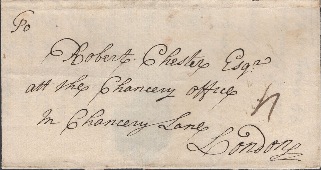 1755 MAIL SOUTH ELMHAM, SUFFOLK TO LONDON WITH 'BUNGEY' HAND STAMP (SK60). Letter from South Elmham dated 24th May 1755, letter slightly fragile, 'To Robert Chester Esq, att The Chancery Office in Chancery Lane, London', charged '4' and on reverse light strike 'BUNGEY' straight line hand stamp in black with ERROR OF SPELLING (SK60) part overstruck London Bishop mark '26/MA'. Letter references the 'Deeds returned.... by the Yarmo Stage Coach'. Tom Slemons records this very scarce hand stamp 1761-1765. (Ref 137891).