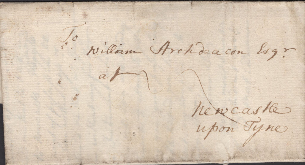 1759 MAIL LONDON TO NEWCASTLE UPON TYNE WITH LONDON 'AE' RECEIVERS HAND STAMP. Letter from London dated 17th Nov 1759 'To William Archdeacon Esq, at Newcastle upon Tyne', charged '3', on reverse London Bishop mark and fine strike circular 'AE' London receivers hand stamp in black. (Ref 139345).