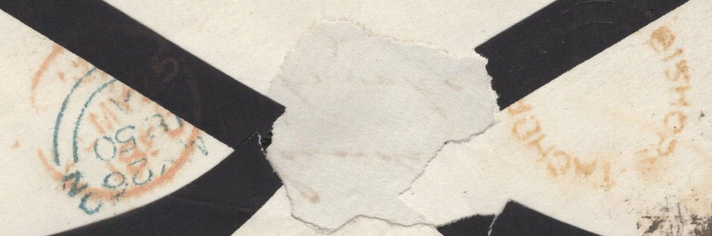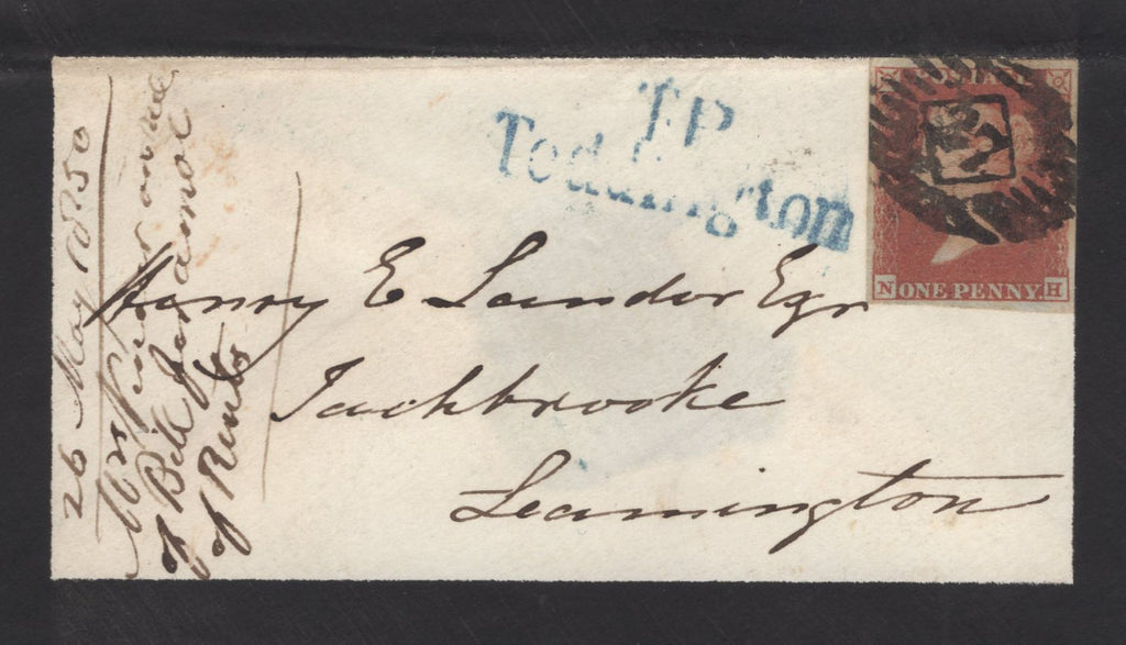 1850 MOURNING ENVELOPE LONDON TO LEAMINGTON WITH 1D (SG8), 'T.P/Teddington' RECEIVERS HAND STAMP AND 'BISHOPS.TACHBROOK' UDC. Fine mourning envelope London to 'Henry E Lander Esq, Tachbrooke, Leamington' with fine 1d (SG8) lettered NH with four fine margins and tied fine strike London '27' Inland Office numeral. Alongside good strike 'T.P/Teddington' receivers hand stamp in blue (L505/TED6b). On reverse 'LEAMINGTON' date stamp MY 26 1850 and good large part strike 'BISHOPS.TACHBROOK' udc in red. (Ref 135101).