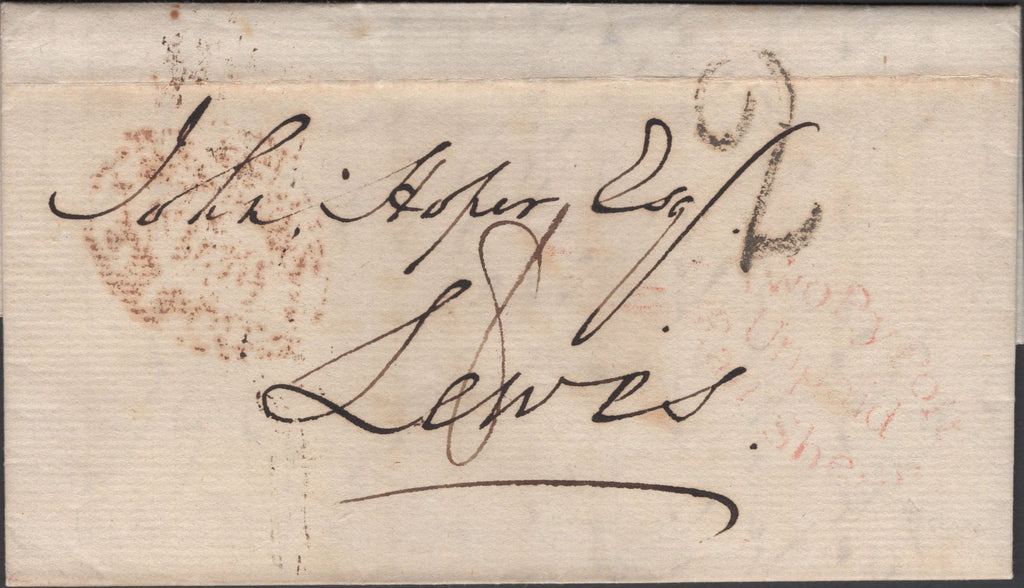 • 135149 1804 MAIL MORTLAKE TO LEWES WITH 'Two Py Poft/Unpaid/East Sheen' RECEIVERS HAND STAMP (L501/ESHE6a).