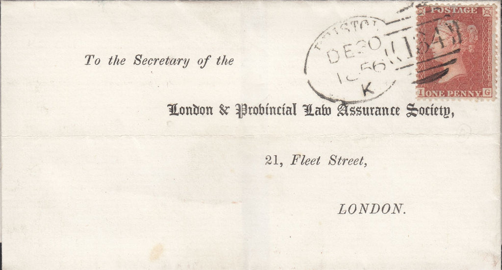 BRISTOL SPOON TYPE A RE-CUT (RA26)/PL.45 (IG)(SG29). Fine wrapper Bristol to 'London and Provincial Law Assurance Society, 21 Fleet Street, LONDON' with very fine die 2 1d pl.45 red-brown on blued paper (SG29) lettered IG tied fine strike BRISTOL/134 spoon type A re-cut (RA26) DE 30 1856 code K. Attractive usage. (Ref 114110).