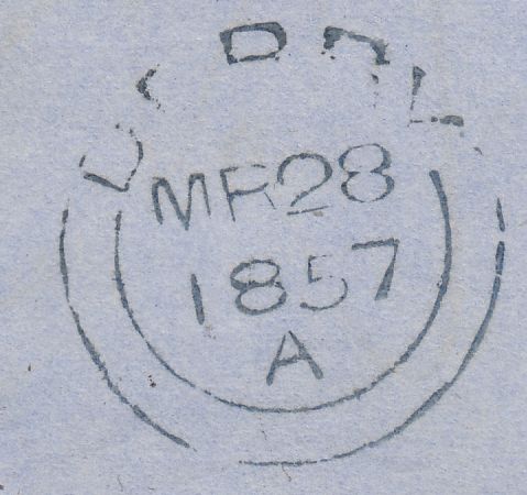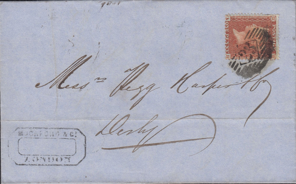 PL.32 (AB)(SG29) ON COVER/MISSING IMPRIMATUR LETTERING. Fine letter Kennet Wharf to Derby with good die 2 1d pl.32 red-brown on blued paper (SG29) lettered AB, several short perforations at top, tied London "23" Inland Office numeral. On reverse London date stamp MR 27 1857. (Ref 114157).