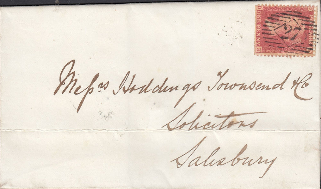 PL.47 (BH) PALE RED ON TRANSITIONAL PAPER (SPEC C9(3) ON COVER. Fine wrapper London to Salisbury with die 2 1d pl.47 lettered BH, trimmed perfs at foot but in a fine PALE RED SHADE ON TRANSITIONAL PAPER (spec C9(3), tied fine strike London "27" Inland Office numeral. On reverse London date stamp JU 5 1857. (Ref 114167).