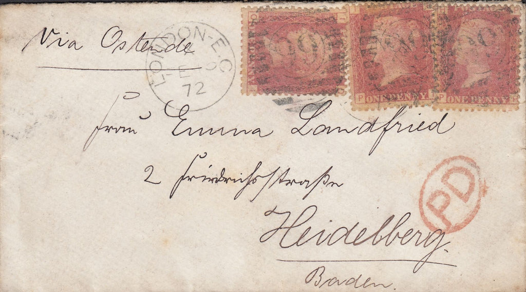 1872 MAIL LONDON TO HEIDELBERG/1D PL.149 (SG43). Envelope London to Heidelberg Baden with 1d pl.149 (SG43) x 3 lettered OI PI PH tied LONDON/99 duplexes FE 15 72. (Ref 114900).