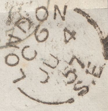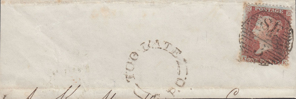 PL.23 (KK)(SG29) ON PIECE. Small piece London to Edinburgh with fine used Die 2 1d pl.23 red-brown on blued paper (SG29) lettered KK, both showing the distinctive 'GOTHIC K' and tied London 'S.E.3' numeral. On front circular 'TOO LATE/G.P.O' hand stamp, on reverse 'Newington.Causeway' receivers hand stamp and LONDON date stamp JU 4 1857. (Ref 117045).