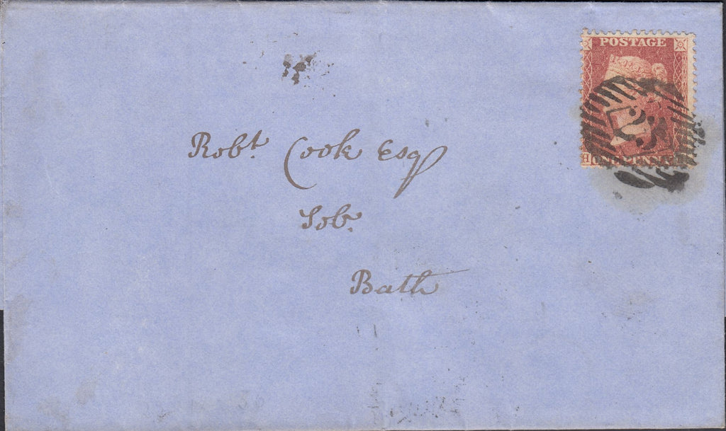 PL.29 (SG29)(HB) ON COVER LONDON TO BATH. Wrapper London to 'Robt Cook Esq Solr. Bath' with good to fine die 2 1d pl.29 red-brown on blued paper (SG29) lettered HB tied fine strike London '23' Inland Office numeral. On reverse London and Bath date stamps DE 22 and DE 23 1856 respectively. (Ref 119923).