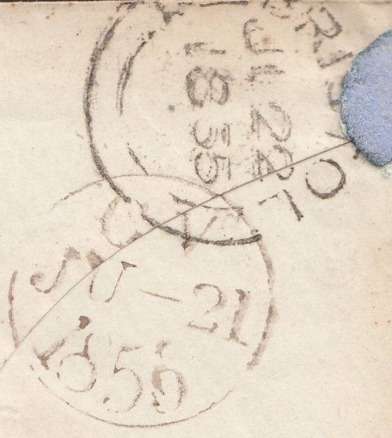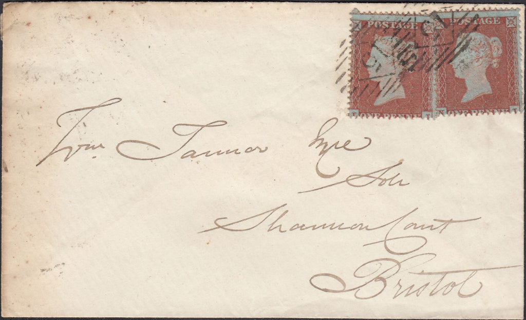 1855 MAIL LONDON TO BRISTOL WITH 1D RES.PL.2 (SG17)(LI NJ). Envelope from London to 'Wm. Tanner Esqre., Solr, Shannon Court, Bristol' with 1d die 1 Res.pl.2 S.C.16 (SG17) x 2 lettered LI and NJ, both centred low and with short perforations, tied fine strikes London '15' Inland Office numerals. On reverse 'BRISTOL' date stamp JU 22 1855. (Ref 131142).