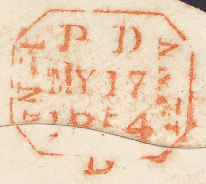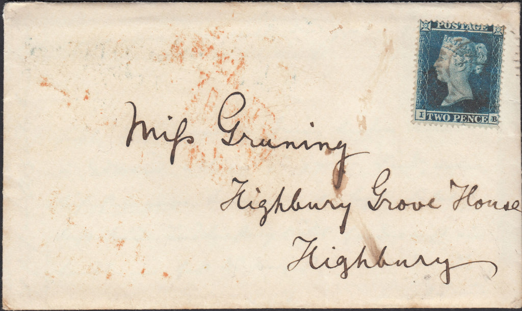 1854 MAIL USED IN LONDON WITH 2D BLUE PL.4 S.C.16 (SG19)(IB). Envelope with letter used in London to 'Mifs Gruning, Highbury Grove House, Highbury' with good used 2d blue pl.4 S.C.16 (SG19) lettered IB slight sulphurisation and one short perf, cancelled London District Office numeral. On reverse London date stamp MY 17 1854. Stamp shows corrosion marks in letter squares. (Ref 134324).