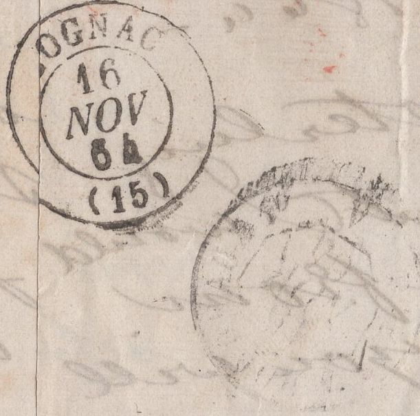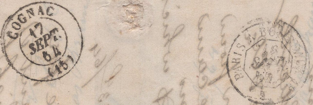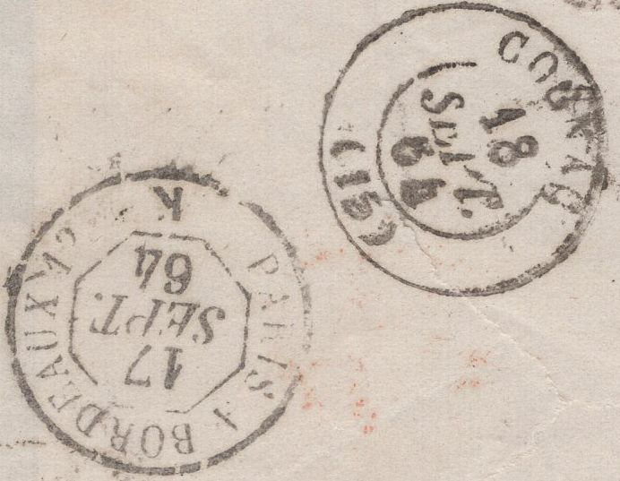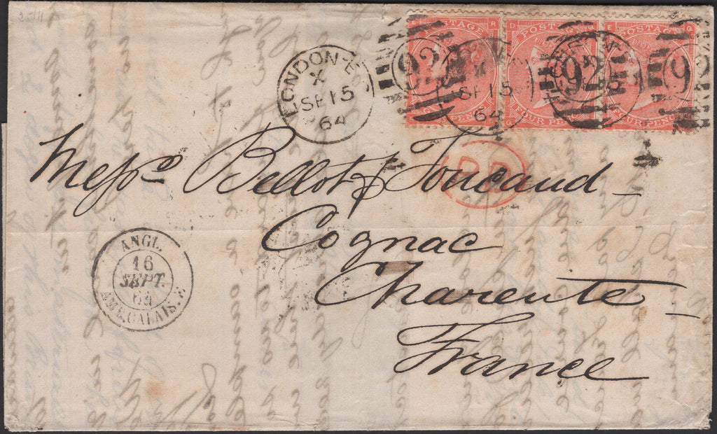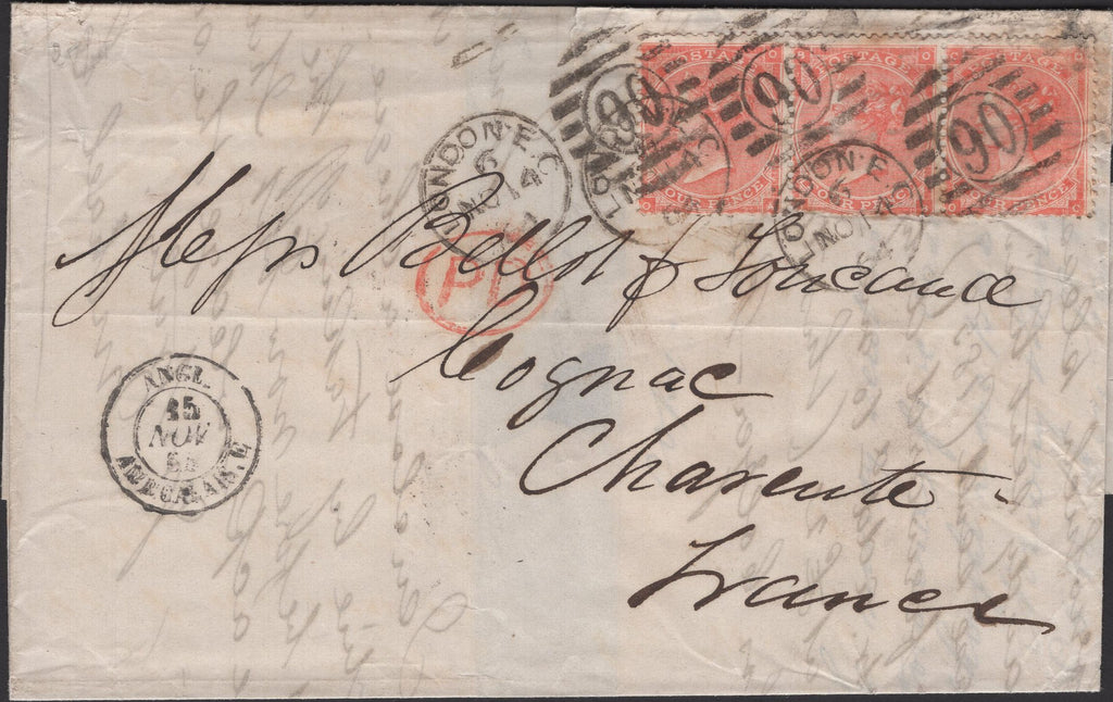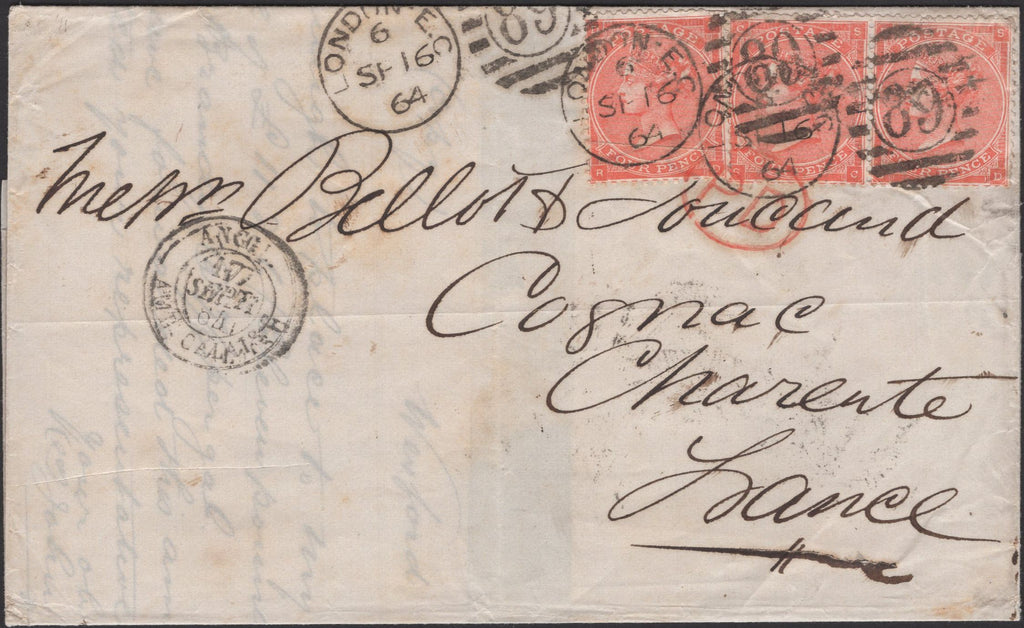 TRIO 1864 LETTERS FROM LONDON TO COGNAC, CHARENTE, FRANCE EACH WITH STRIP OF THREE 4D PALE RED (SG82). Three fine letters, slight creasing, all from London in 1864 to the same correspondent and referring to the importation of brandy, addressed to 'Messrs Bellot and Foucance, Cognac, Charente, France', each with a strip of three 4d pale red (SG82) with 'LONDON-E.C/90' duplexes. (3 items). (Ref 135164).