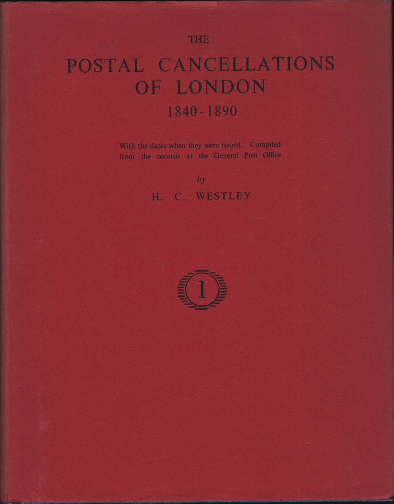 'POSTAL CANCELLATIONS OF LONDON 1840-1890' BY WESTLEY. Fine copy 1950 hardback, 170 pages published H F Johnson, contents: The London Post, Early Machine Obliterators (Pearson Hill, Rideout, Azemar, Postcards, Sloper, Hoster, Etheridge and Cresswell), The Inland Branch, The Foreign Branch, The Newspaper Branch, The Registered letter Branch, The Returned letter Branch, The London District Post, The East Central District Office, and the London District Office with sections on various Branches. Excellent reference particularly experimental cancellations. (Ref 140420).