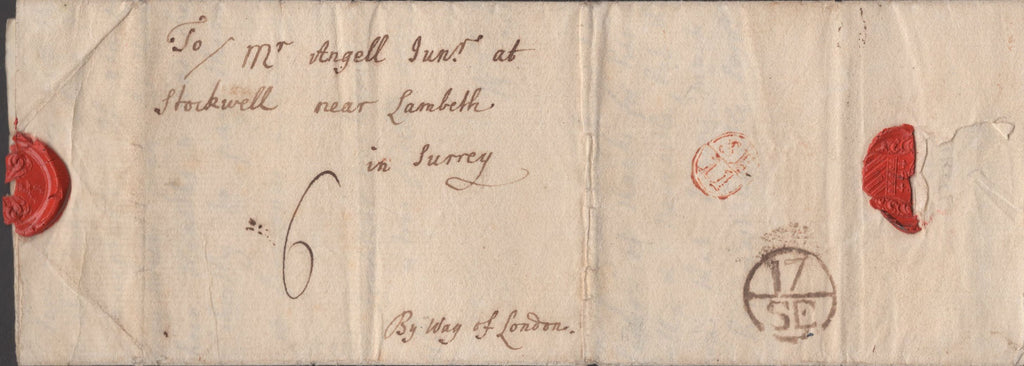 1722 MAIL EDINBURGH TO LONDON WITH EDINBURGH AND LONDON BISHOP MARKS ALSO MANUSCRIPT 'BY WAY OF LONDON'. Fine letter from Edinburgh dated SEP 11 1722 to ' Mr Angell Jnr, at Stockwell near Lambeth in Surrey', endorsed 'By way of London' and charged '6 '. 1 On reverse Edinburgh Bishop Mark in red 'SE/11' also fine strike London Bishop Mark '17/SE'. Fine usage with both Edinburgh and London Bishop marks and instructional manuscript. (Ref 141408).