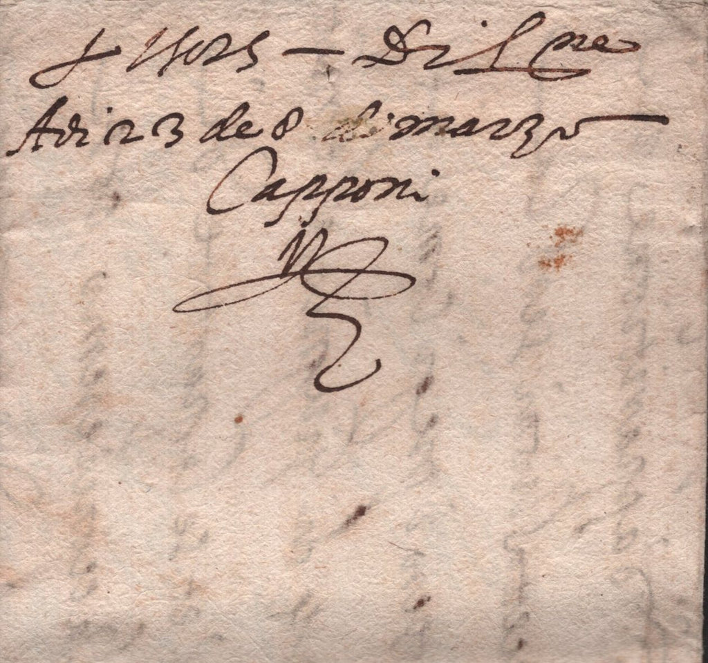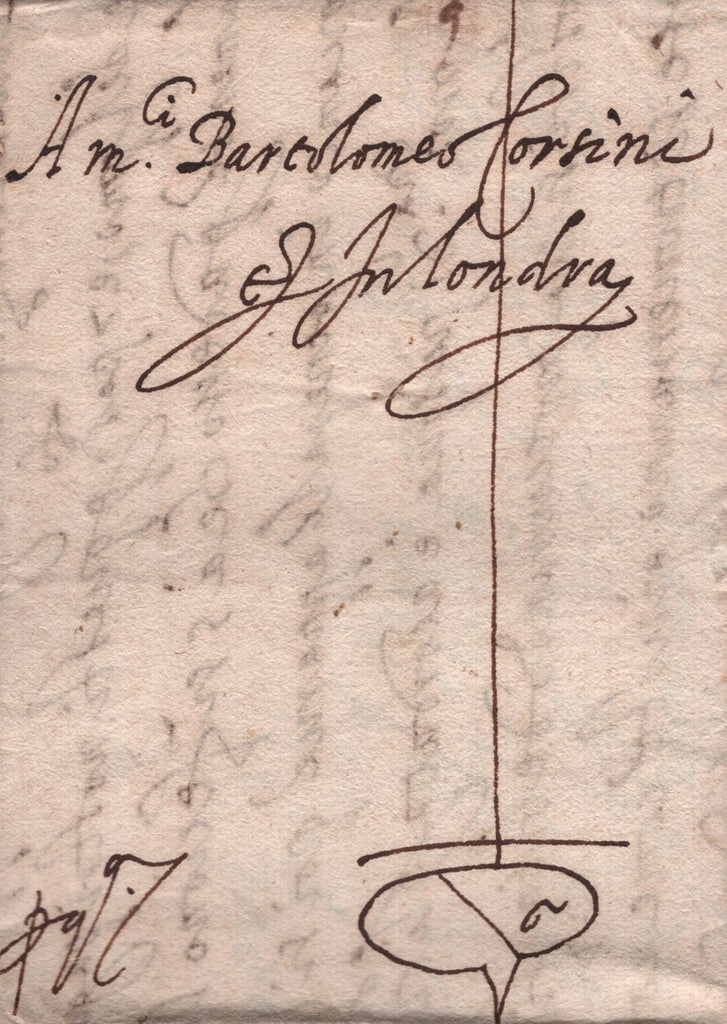 1586 MAIL FROM VENICE TO BARTOLOMEO CORSINI IN LONDRA VIA MERCHANT STRANGERS POST WITH CAPPONI'S GUILD SIGN ON FRONT. A fine letter from Luigi Capponi in Venice dated 1586 to Bartolomeo Corsini in Londra, endorsed 'pq7' advising that the recipient will pay the postage of '7' (groats?), also on front very fine hand drawn Guild sign of the Capponis. (Ref 141840).