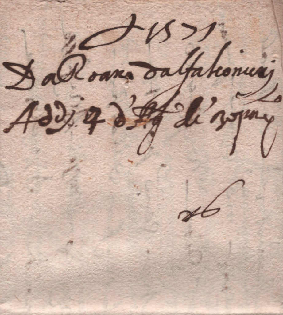 1571 MAIL FROM ROUEN, FRANCE TO FILIPPO CORSINI IN LONDON WITH MANUSCRIPT 'pq'. Fine entire letter from Rouen dated 30th July 1571 to Filippo Corsini in London endorsed 'pq' advising that the recipient will pay postage. Transcript of letter accompanies which confirms payment of 110 scudi and asking the addressee to be more careful in the handling of our goods referring to some goods having been stolen. Also advising that the 6 florins for the velvet cloth and references that the messenger arrives daily, he will be helpful to you if he can and if you have anything to be done tell him. (Ref 141842).
