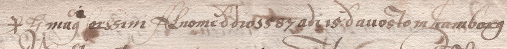 1587 MAIL FROM HAMBURG TO BARTOLOMEO CORSINI IN LONDON WITH GUILD SIGNS WITHIN. A fine entire letter from Martino Enserperger in Hamburg dated 26th August 1587 to Bartolomeo Corsini in London endorsed 'con La nave de Hans Romers ideo salug' - by the ship of Hans Romers good health. Within manuscript 'recomando nel ritto la nave de Hans Romers' - to the care of the upright/faithful ship master Hans Romers. Within have been drawn four Guild signs. Very fine. (Ref 141844).