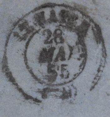 1855 REGISTERED MAIL LONDON TO HAVRE, FRANCE WITH STRIP OF FOUR 2D BLUE PL.4 S.C.14 (SG23). Fine wrapper from London sent registered mail to Havre with fine strip of four 2d blue pl.4 S.C.14 (SG23) lettered QC QD QE QF, centred slightly high, tied London '24' Inland Office numerals and part strike 'CHARGE' handstamp in black. At left manuscript 'Registered' and on reverse 'LE HARVE' date stamp 28 MAI 55. Also on front 'Earl St BKLR' London receivers handstamp in blue (L514/EARL4b). Stamps paying 4d ¼ oz rate and 4d registration. Very fine usage. (Ref 141876).