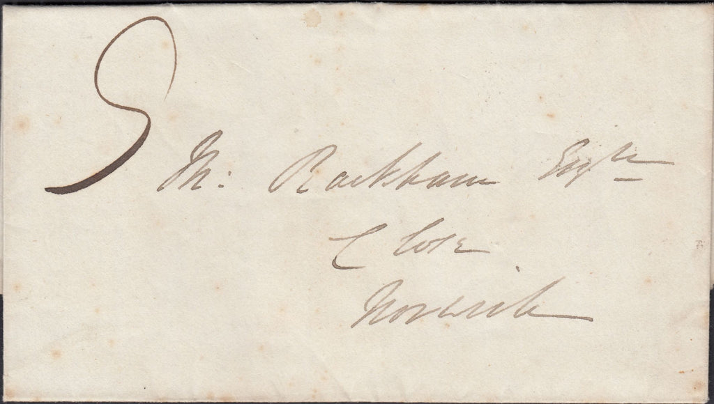 CIRCA 1828-1839 MAIL MILDENHALL TO NORWICH WITH 'MILDENHALL/PY POST' (SK258). Fine undated wrapper from Mildenhall to Norwich, charged '9' and on reverse good strike boxed 'Mildenhall/Py Post' hand stamp in black (SK258) recorded in use 1828-1839. (Ref 125971).