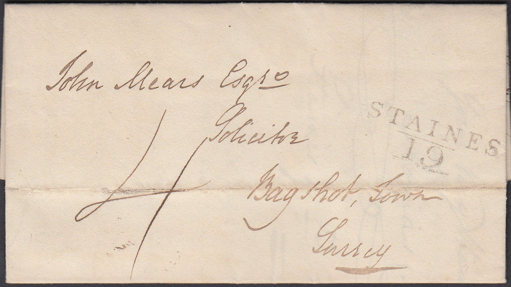 1813 MIDDLESEX/'STAINES 19' MILEAGE MARK (MX267). Entire Staines to 'Bagshot Town Surrey' dated 19th March 1813 with good strike "STAINES/19" mileage mark in black (MX267), filing fold clear of hand stamp. (Ref 87278).