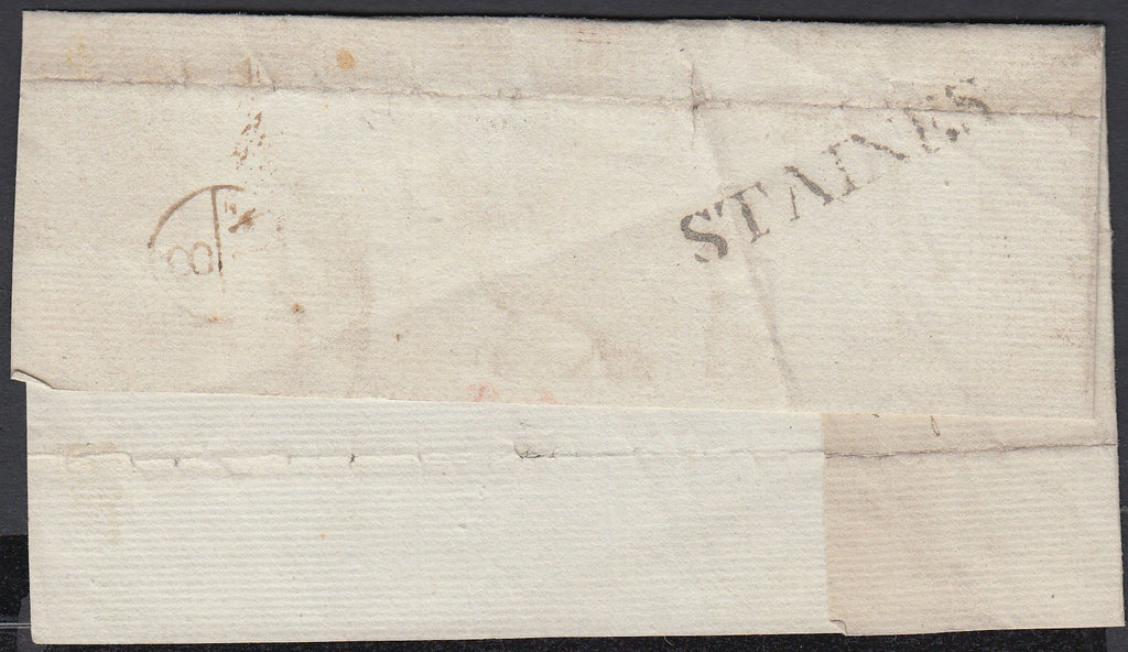 1776 MIDDLESEX/'STAINES' HAND STAMP. Large piece Staines to London (filing folds) with good strike STAINES straight line hand stamp in black (MX256). (Ref 87280).