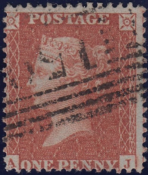 PL.9 (AJ)(SG24)/MISSING IMPRIMATUR LETTERING. Good used 1855 Die 2 1d pl.9 S.C.14 (SG24) lettered AJ, one short perforation at upper right. Scottish cancellation. MISSING IMPRIMATUR LETTERING. (Ref 116176).