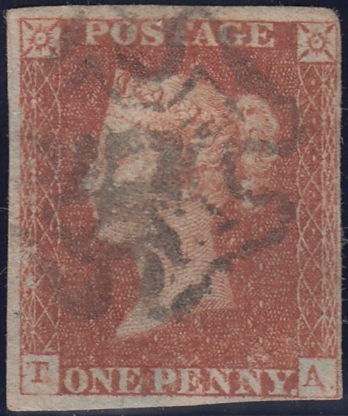 PL.31 (SG8)(TA) MISSING IMPRIMATUR LETTERING. Used 1843 1d pl.31 (SG8) lettered TA, corner bend and surface scuff, four close to fine margins and black Maltese Cross. MISSING IMPRIMATUR LETTERING. (Ref 120234).